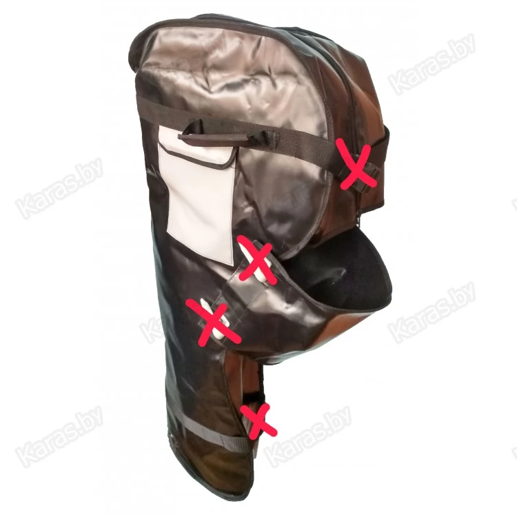 Чехол выполнен из прочной тентовой ПВХ-ткани плотностью 630 г/м2. Изнутри чехол обшит непромокаемым полипропиленовым полотном, которое обладает стойкой к истиранию структурой и не подвергается коррозийному растрескиванию, а также обладает высокой химической стойкость и отлично выдерживает воздействие бензина и масел. Противоударная прокладка (8 мм) позволит избежать механических повреждений при транспортировке. Снаружи дно чехла усилено вторым слоем ПВХ-ткани плотностью 630 г/м2. Чехол закрывается на надежную молнию (12мм) и замыкается на стягивающие защелки. Сбоку на чехле имеется мягкая ручка для поднятие в багажник машины или прицеп. Под ручкой расположен карман для различного рода мелочевки. Конструкция чехла позволяет использовать его для перевозки мотора на транце лодки.