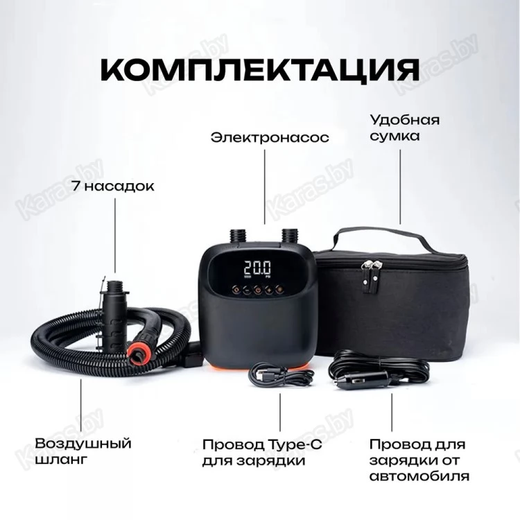 6 насадок в комплекте порадуют любителей активного вида отдыха, ведь можно будет накачивать от маленького матраса до огромной палатки, лодки и SUP доски. И все это можно хранить в качественной и красивой сумке, которая так же идет в комплекте.