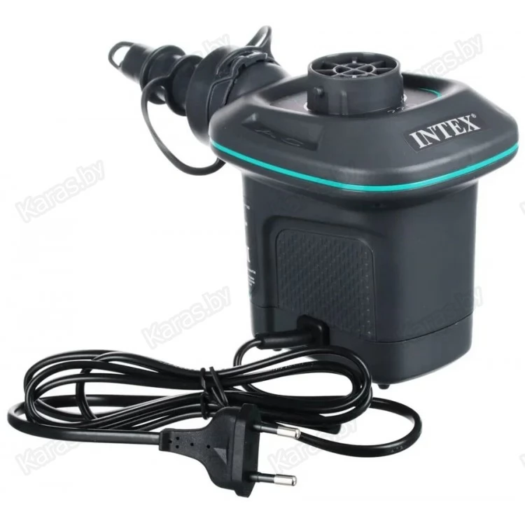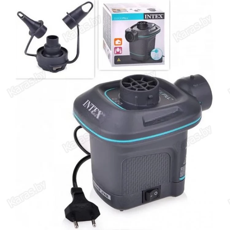 Воздушный насос "Intex Quick-Fill Pump 66640" с питанием от сети 220В. В комплекте с насосом идут 3 насадки, используя которые, можно быстро и без применения физических усилий надувать любые надувные конструкции: кровати, матрасы, лодки, бассейны, батуты, игровые центры для детей и т.д.