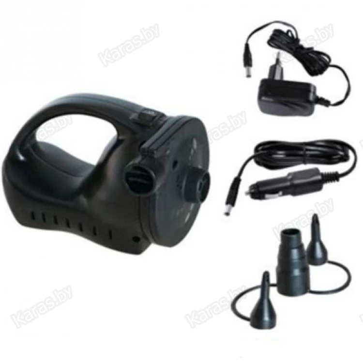 Насос заряжается как от сети 220В так и от 12В (прикуриватель). Для зарядки от сети 220В рекомендуется применять только зарядное устройство поставляемое с насосом. Насосы данного типа создают объем в балоне лодки, а докачивать лодку с рекомендованным давлением придется ножным насосом.