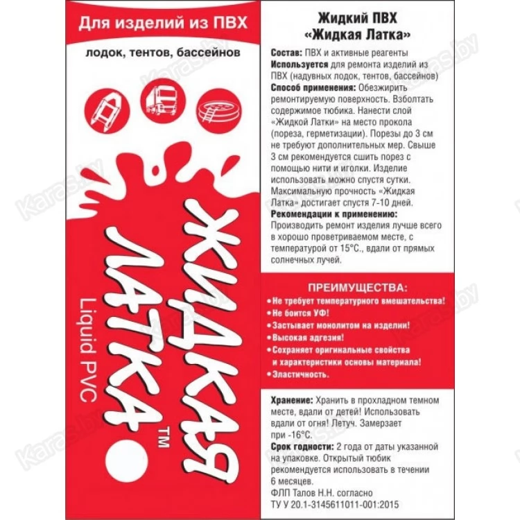 Жидкая латка является инновационным продуктом на рынке для ремонта надувных бассейнов, кроватей, лодок пвх, автомобильных тентов и др. Всего 1 тюбик (20 грамм) способен отремонтировать 20-25 проколов!