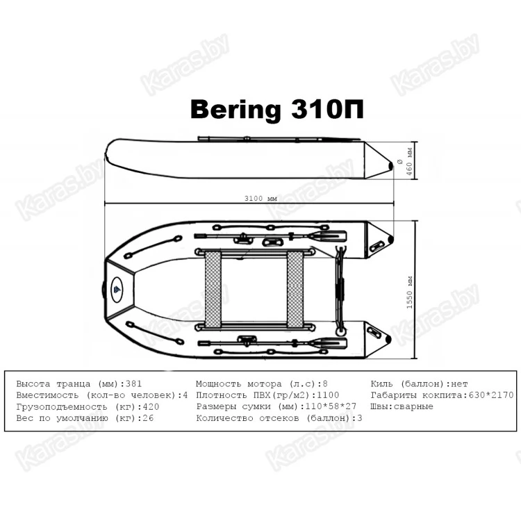 Лодка Bering 340П является транцевой плоскодонной лодкой с габаритными размерами 3400х1650 мм и диаметром бортовых баллонов 460 мм. Данная лодка позволяет перевозить груз весом до 450 кг. Лодка состоит из 3 независимых надувных отсеков, позволяющих сохранить плавучесть лодки даже при аварийном проколе 2 из них. Каждая лодка укомплектована удобными и практичными лавками, которые свободно можно перемещать вдоль борта лодки. В стандартную комплектацию лодки входит пол-книжка. Также в стандартную комплектацию входят весла длиной 1,6 м. Лодки серии Bering подходят как для спокойного плавания в небольших водоемах, так и для экстремального плавания в крупных водоемах и морях.