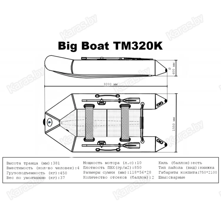 Лодка Big Boat ТМ320К является транцевой килевой лодкой с габаритными размерами 3200х1550 мм и диаметром бортовых баллонов 400 мм. Грузоподъемность этой лодки до 450 кг. Конструкция лодки предусматривает наличие 2+1 независимых надувных отсеков, которые позволяют сохранить плавучесть лодки даже при аварийном проколе 1 из них. В стандартную комплектацию входят удобные и практичные лавки, свободно перемещающиеся вдоль борта лодки, а также весла. Лодки из серии Big Boat рассчитаны для эксплуатации в небольших водоемах и реках. Идеально подходят любителям рыбалки и охоты, а также спокойного семейного отдыха.