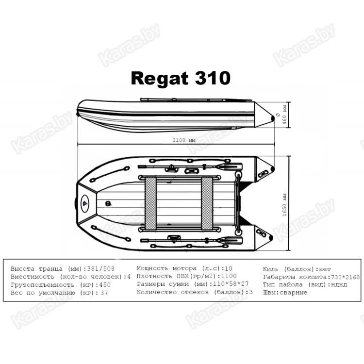 Лодка Regat 310 является транцевой лодкой с габаритными размерами 3100х1650 мм и диаметром бортовых баллонов 460 мм. Грузоподъемность этой лодки до 450 кг. Лодка состоит из 3+1 независимых надувных отсеков, позволяющих сохранить плавучесть лодки даже при аварийном проколе 2 из них. Каждая лодка укомплектована удобными и практичными лавками, которые свободно можно перемещать вдоль борта лодки. Также в стандартную комплектацию лодки входят весла длиной 1,6 м. Тип пайола лодки – надувное дно низкого давления. Лодки из серии Regat за счет НДНД просты в сборке и имеют мягкий ход на небольшой волне. Для этих лодок подходящими условиями эксплуатации являются крупные водоемы и море. Подходят как для спокойного плавания, так и для экстремальных спусков по горным рекам.