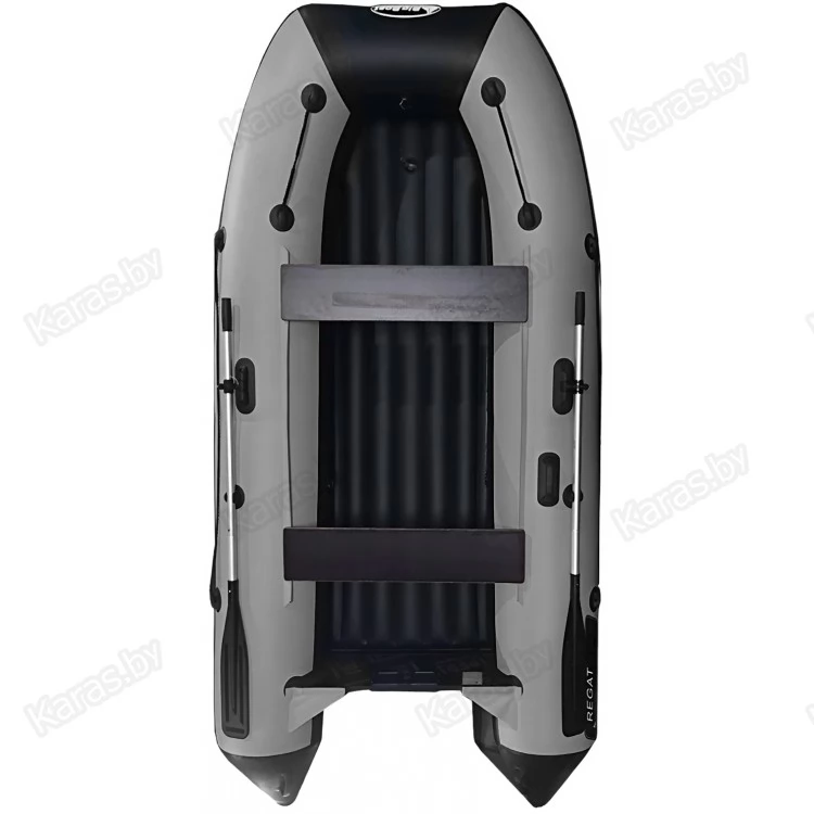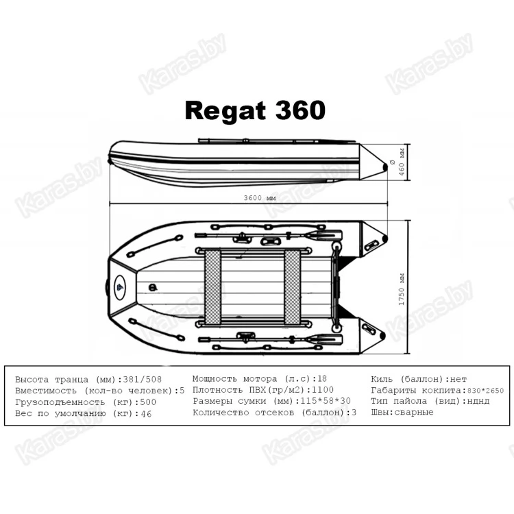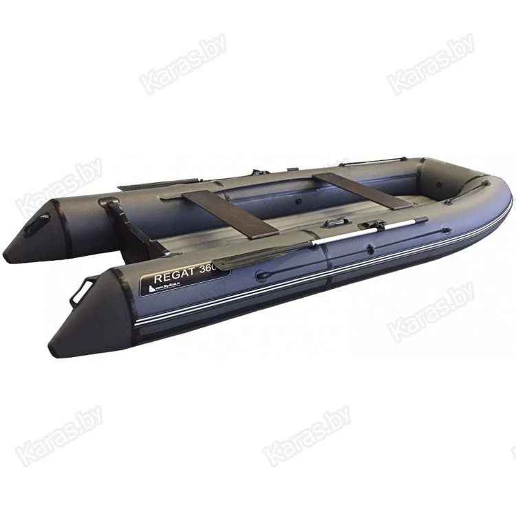 Лодка Regat 360 является транцевой лодкой с габаритными размерами 3600х1750 мм и диаметром бортовых баллонов 460 мм. Грузоподъемность этой лодки до 500 кг. Лодка состоит из 3+1 независимых надувных отсеков, позволяющих сохранить плавучесть лодки даже при аварийном проколе 2 из них. Каждая лодка укомплектована удобными и практичными лавками, которые свободно можно перемещать вдоль борта лодки. Также в стандартную комплектацию лодки входят весла длиной 1,6 м. Тип пайола лодки – надувное дно низкого давления. Лодки из серии Regat за счет НДНД просты в сборке и имеют мягкий ход на небольшой волне. Для этих лодок подходящими условиями эксплуатации являются крупные водоемы и море. Подходят как для спокойного плавания, так и для экстремальных спусков по горным рекам.