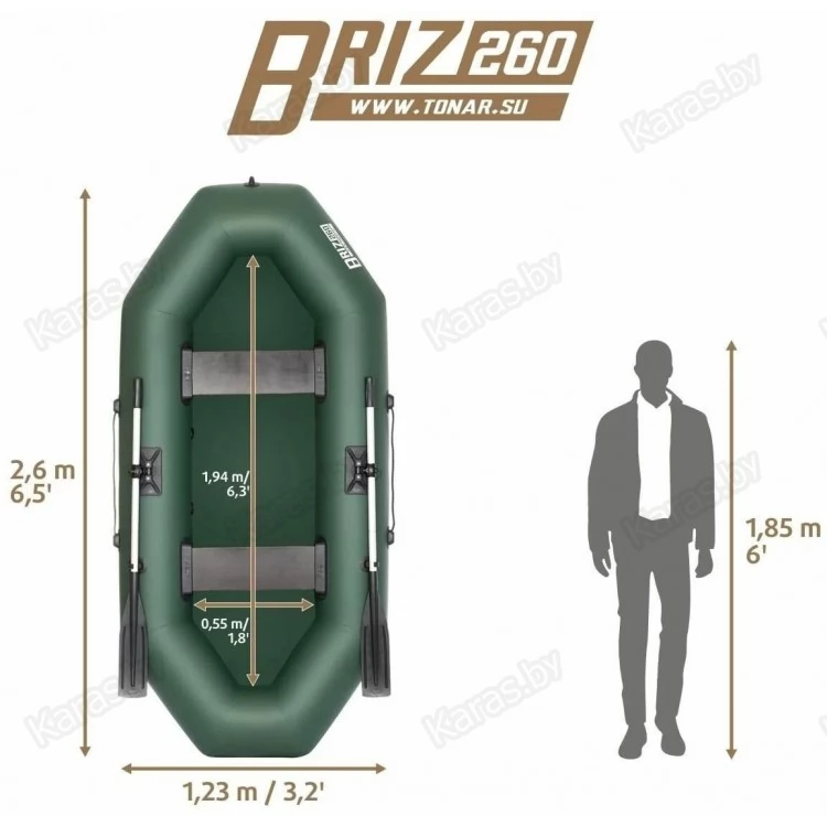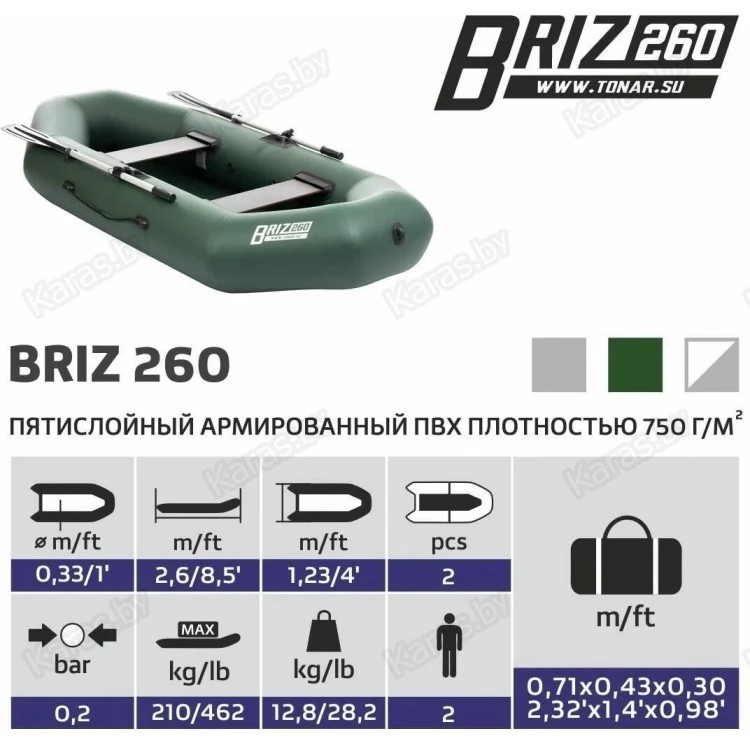Надувная лодка «БРИЗ 260» производства компании ТОНАР двухместная лодка с классической О-образной формой. Баллон лодки разделен перегородками на 2 независимых отсека, что гарантирует безопасность пребывания на воде. Просторный кокпит позволит свободно разместиться двум пассажирам и при этом удобно расположить необходимый груз. На лодке используется современная и надежная фурнитура отечественных производителей.