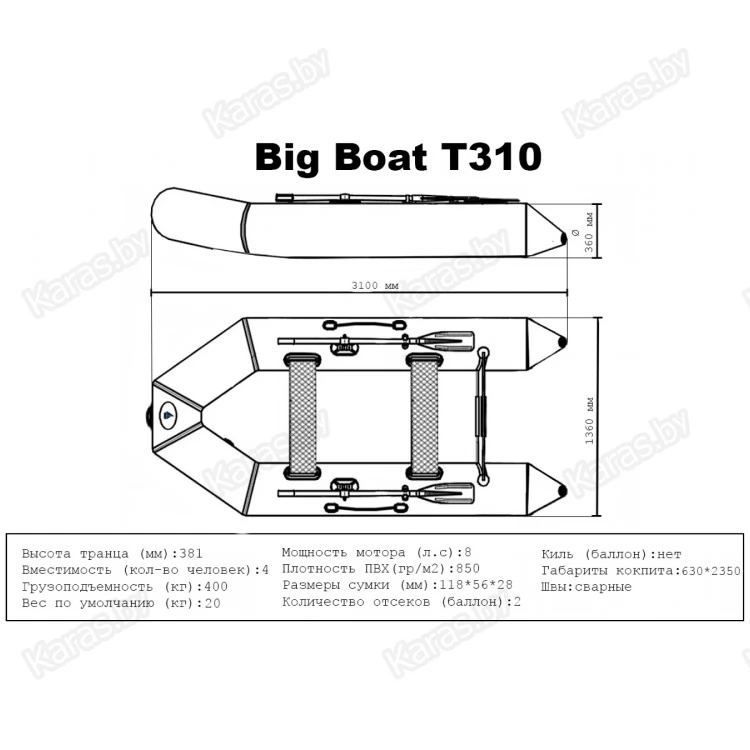 Надувная 4-местная ПВХ лодка Big Boat T310 является транцевой плоскодонной лодкой с габаритными размерами 3100х1360 мм и диаметром бортовых баллонов 360 мм. Грузоподъемность этой лодки до 400 кг. Лодка состоит из 2 независимых надувных отсеков, позволяющих сохранить плавучесть лодки даже при аварийном проколе 1 из них. В стандартную комплектацию входят удобные и практичные лавки, свободно перемещающиеся вдоль борта лодки, а также весла. Лодки из серии Big Boat рассчитаны для эксплуатации в небольших водоемах и реках. Идеально подходят любителям рыбалки и охоты, а также спокойного семейного отдыха.