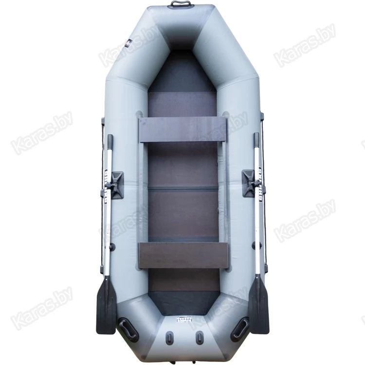 Весла выполнены из анодированного алюминия, лопасти - пластиковые. Весла для удобства транспортировки разбираются в половину длины. Благодаря жесткой слани (пол-книжка 81х76х0,5 см) в лодке удобно рыбачить стоя. Передвижные сидения позволяют настроить внутреннее пространство лодки под любой вкус.