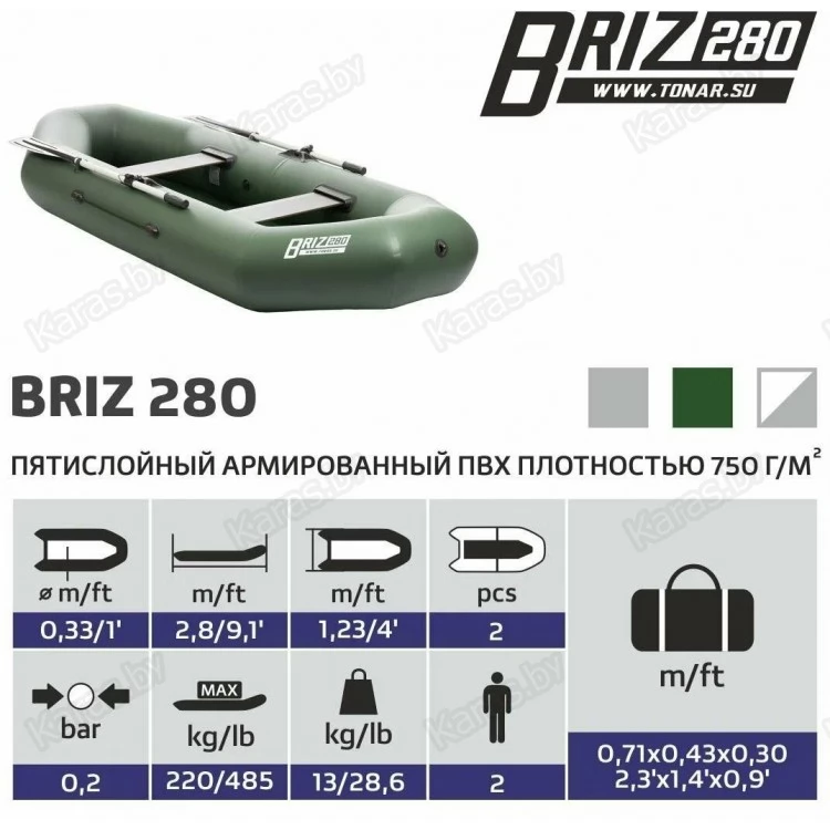 Надувная лодка «БРИЗ 280» производства компании ТОНАР двухместная лодка с классической О-образной формой. Баллон лодки разделен перегородками на 2 независимых отсека, что гарантирует безопасность пребывания на воде. Просторный кокпит позволит свободно разместиться двум пассажирам и при этом удобно расположить необходимый груз. На лодке используется современная и надежная фурнитура отечественных производителей. Лодка идеально подойдет как для любителей рыбалки и охоты, так и для прогулок и отдыха на воде.