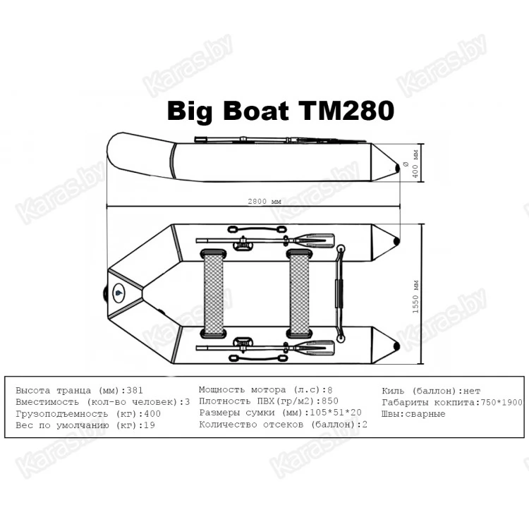 Лодка Big Boat ТМ280 является транцевой плоскодонной лодкой с габаритными размерами 2800х1550 мм и диаметром бортовых баллонов 400 мм. Грузоподъемность этой лодки до 400 кг. Лодка состоит из 2 независимых надувных отсеков, позволяющих сохранить плавучесть лодки даже при аварийном проколе 1 из них. В стандартную комплектацию входят удобные и практичные лавки, свободно перемещающиеся вдоль борта лодки, а также весла. Лодки из серии Big Boat рассчитаны для эксплуатации в небольших водоемах и реках. Идеально подходят любителям рыбалки и охоты, а также спокойного семейного отдыха.