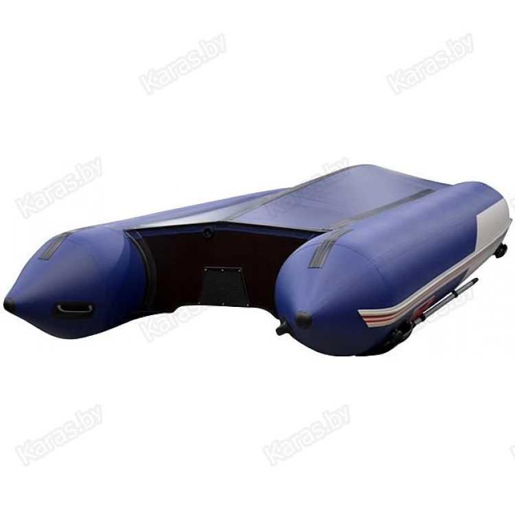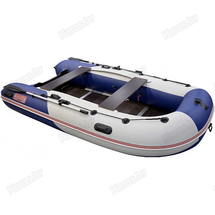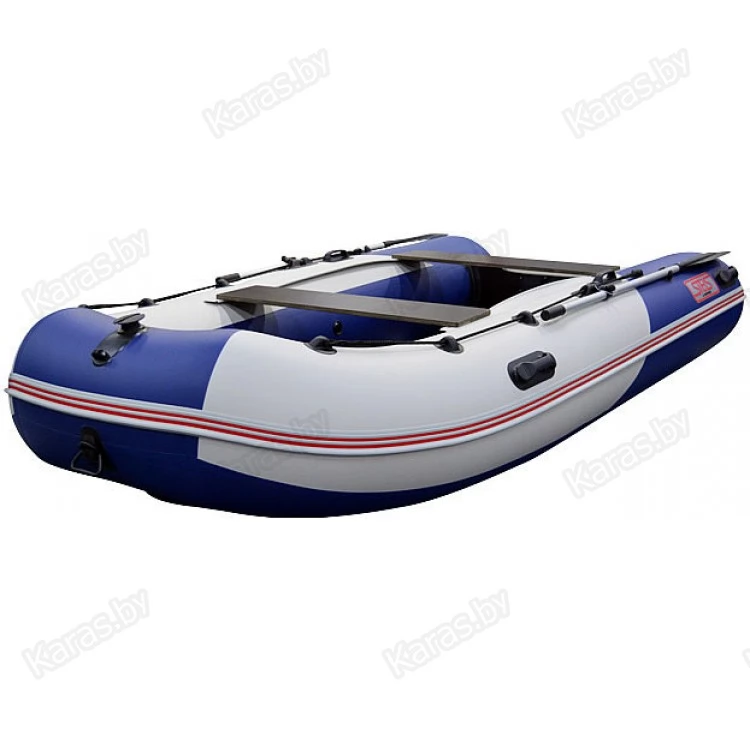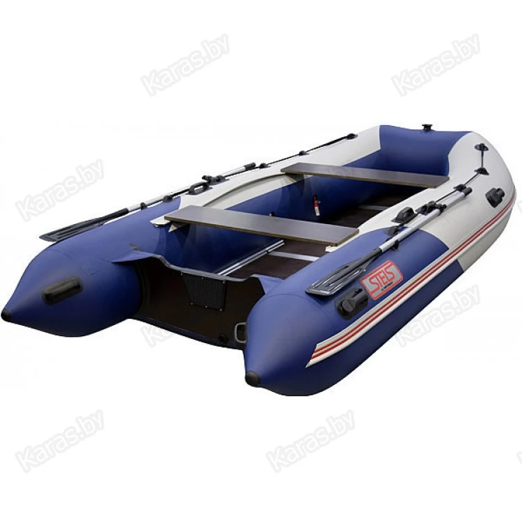 Надувная лодка СТЕЛС 355 изготовлена и ПВХ ткани плотностью 950 гр/м.кв., а разборный пайольный пол изготовлен из ламинированной водостойкой фанеры, толщиной 12 мм.