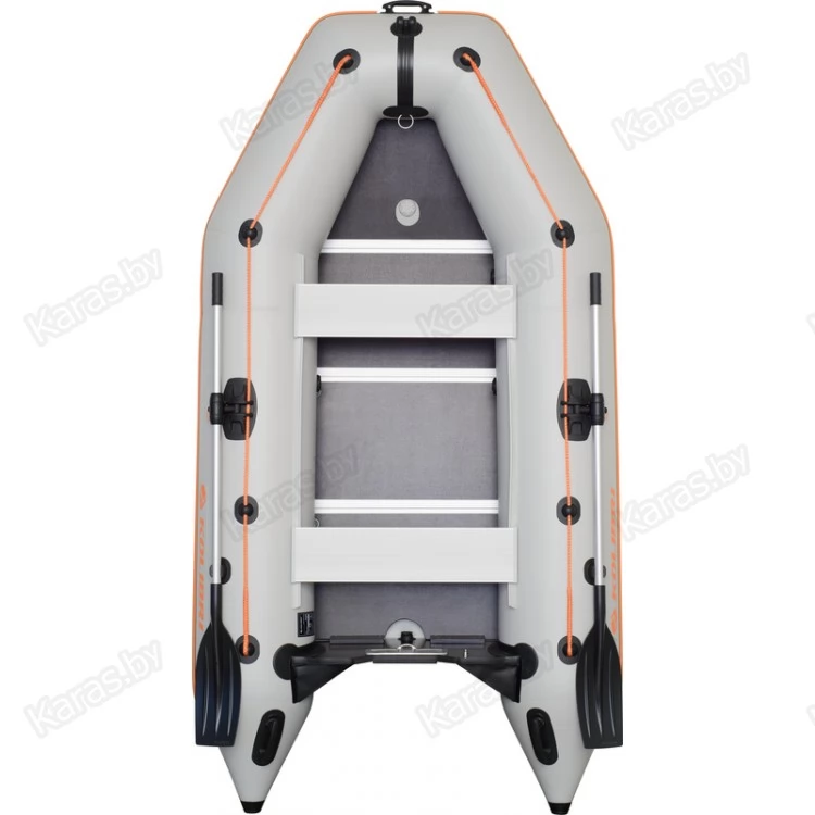 Корпус лодки ПВХ состоит из двух надувных баллонов диаметром 42 см., разделенных на три независимых отсека, что в случае выхода из строя одного из отсеков позволит сохранить положение равновесия и безопасно добраться до берега.