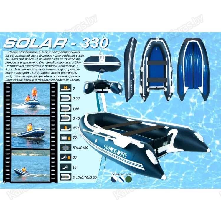 Лодка подойдёт для таёжных рек с завалами и мелководьем. SOLAR-330 имеет оригинальный, отличающий её дизайн и органично дополняет серию мобильных лодок от Солар.