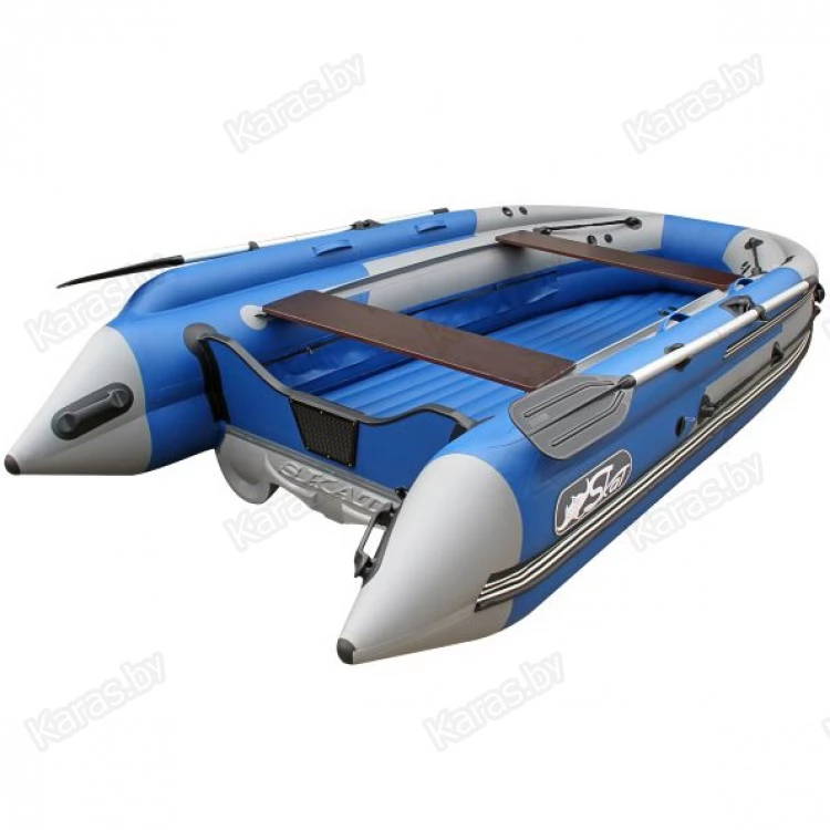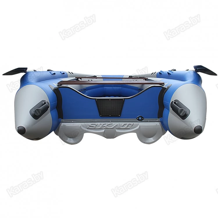 Надувная лодка SKAT Triton обладает надувным дном низкого давления. Надувное дно представляет собой независимый герметичный отсек, вклеенный между баллонами надувной лодки. Одним из очевидных плюсов такой конструкции является малый вес, компактность и жесткость в собранном виде. При сборке надувной лодки с дном низкого давления, как таковой монтаж пола отсутствует – достаточно просто накачать отсеки лодки и установить сиденья и весла.