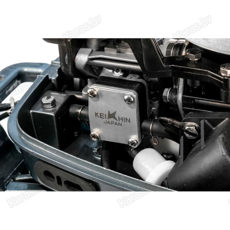 Коробка передач имеет три положения – нейтральное для запуска двигателя, переднюю и заднюю скорости. Различные режимы дифферента наклона двигателя позволят преодолевать мелководья без ущерба для винта и настроить оптимальный наклон для максимальных скоростных показателей. Усовершенствованная цифровая система зажигания CDI позволит с легкостью осуществить запуск двигателя в любых условиях, а инновационная система подачи топлива Mikatsu (Микатсу) даст значительную экономию расхода топлива. Пятислойное лакокрасочное покрытие не только придает этому мотору красивый внешний вид, но и прекрасно защищает его от воздействия агрессивной внешней среды и дольше будет сохранять внешнее состояние мотора в эстетически достойном виде.