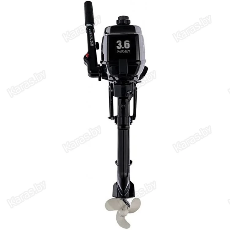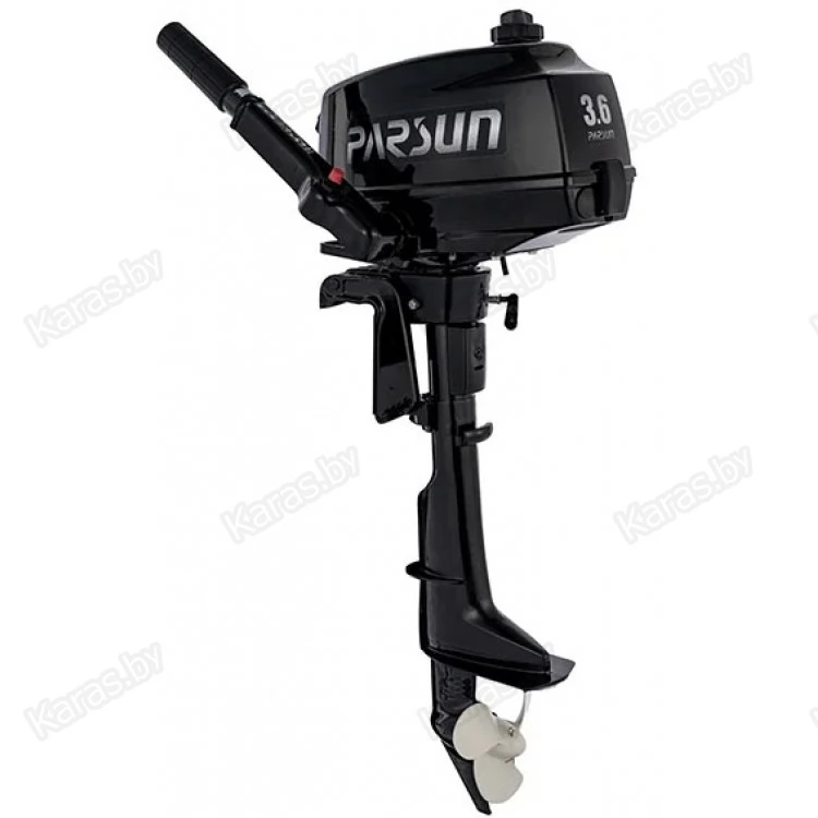 Рычаг дросселя, воздушная заслонка, стартер и выключатель двигателя размещены достаточно удобно, что создает уверенный запуск. Легкость управления и маневренность модели обеспечивает длинная рукоятка рулевого управления, а так же возможности регулировки усилия вращения и угла дифферента мотора. У этой модели легкий алюминиевый гребной винт для эксплуатации в любых условиях. Мотор Парсун 3,6 идеально подходит для надувных лодок, рыболовных лодок, парусных шлюпок и маленьких яхт. Прототипом модели является лодочный мотор 2.6 л.с. торговой марки Yamaha, поэтому некоторые запасные части и детали Parsun T3.6 могут заменяться на подобные моторам Yamaha.