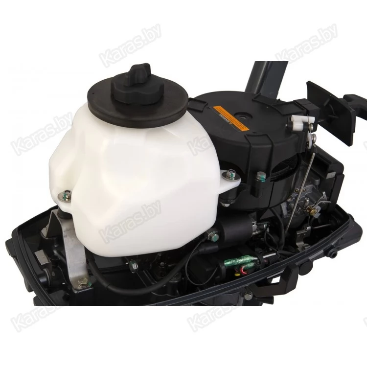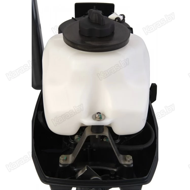 Для движения по мелководью предусмотрен отдельный режим. Уровень вибрации сведен к минимуму. Винт с тремя лопастями выполнен из алюминия. Комплектуется встроенным баком на 2,5 литра и возможностью подключения выносного бака, выносной бак и шланг в комплект поставки не входит. Подходит под лодки с высотой транца 381 мм.