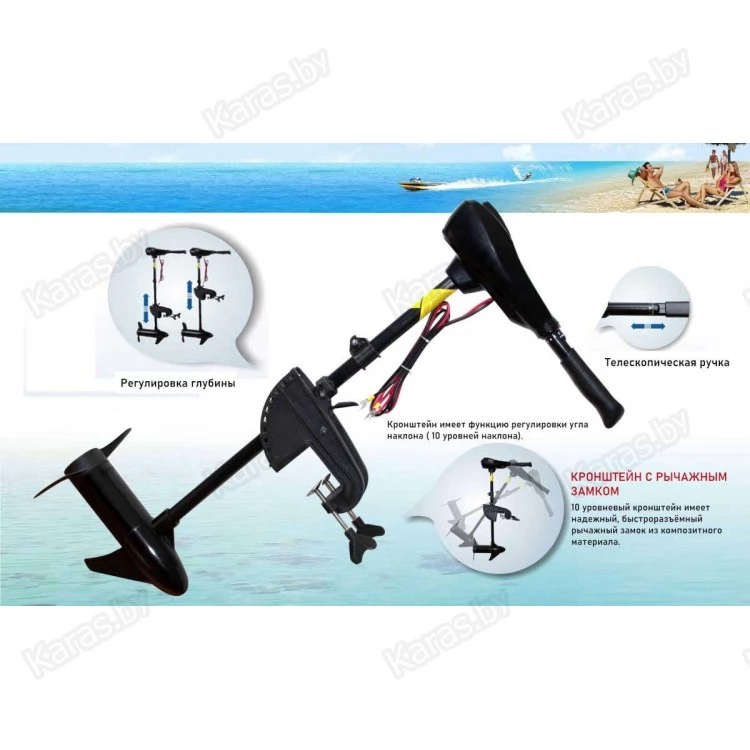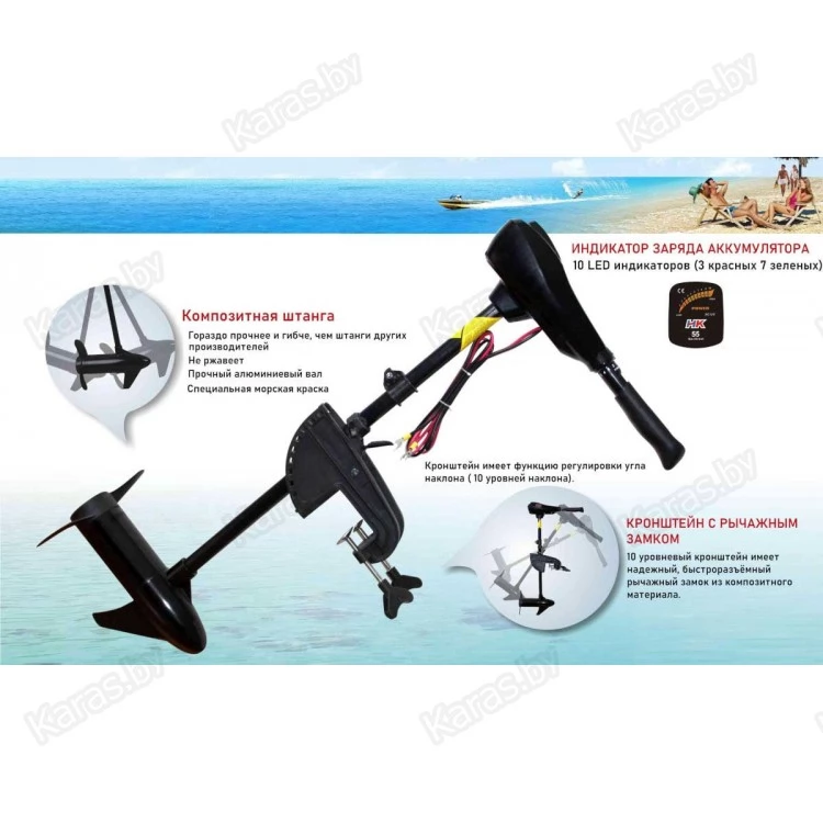 - Крепление и штанга электрического мотора изготовлены из современного прочного композитного материала, устойчивого к деформациям и поломкам.