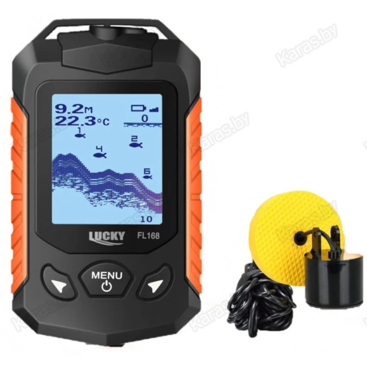 Эхолот Lucky FL168 — это эхолот FF718D c монохромным дисплеем в новом ударопрочном корпусе, который будет полезен любому рыболову. Корпус головного блока с экраном снабжен резиновыми вставками по бокам, с антискользящим покрытием и выступами по бокам корпуса, для более удобного удержания в руке. Сзади находится отсек для четырех батареек типа ААА (батарейки в комплекте не идут). Есть возможность подключения проводного сонара (трансдьюсера) через специальное гнездо в верхней части. В передней части находится экран с 3-мя кнопками управления. Для удобства ношения предусмотрен шнурок, который крепится к специальному ушку на корпусе.