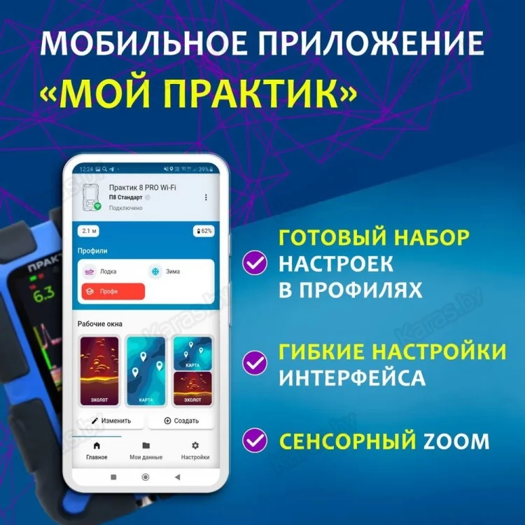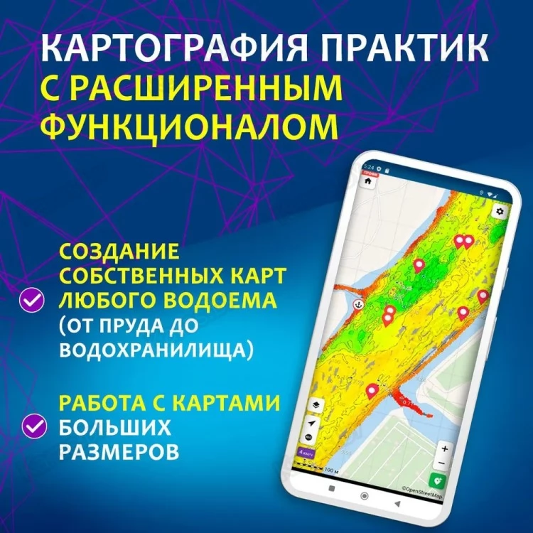 Практик 8 Pro Wi-Fi позволяет создавать карты любых водоемов – от пруда, до водохранилища, работать с картами больших размеров, сохранять карты и загружать их из сторонних источников, отмечать маркеры на скане и на карте и многое другое.