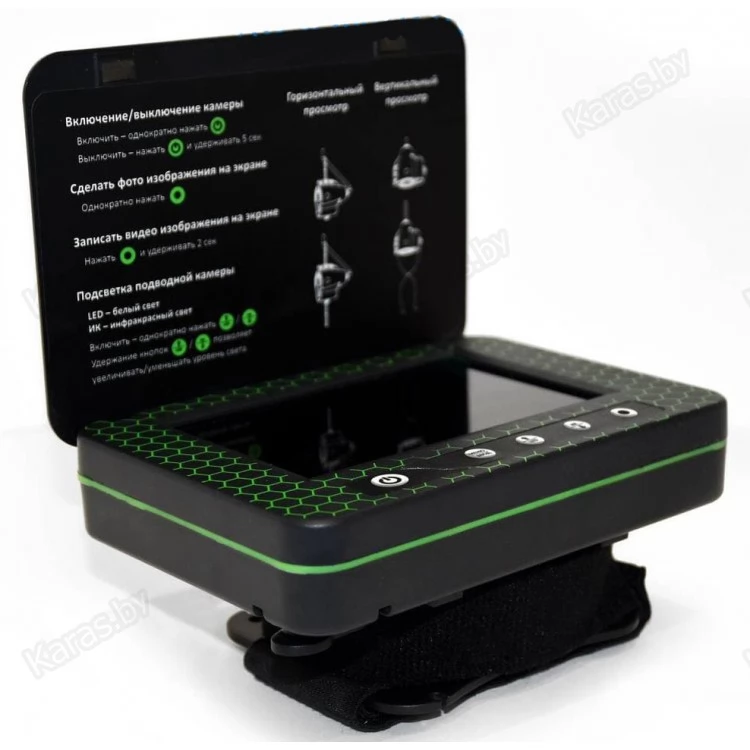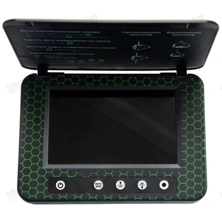 - Переносной 5-дюймовый цветной TFT монитор с высоким разрешением 960х480 показывает четкую и яркую картинку даже на глубине 10-15 м при среднем уровне прозрачности воды. А наличие солнцезащитного козырька обеспечит отсутствие бликов на экране.