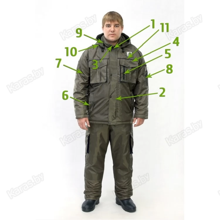 Костюм выполняется из однотонной ткани цвета хакки с черной отделкой и черными кантиками. Куртка удлиненная с рельефным низом (спинка длиннее полочек). Центральная застежка на молнию Т-8 и планкой внахлест на кнопки, внутри ветрозащитная планка. Снабжена затяжками по талии в виде шнура с фиксаторами, обеспечивающими регулировку по фигуре, а также дополнительное сохранение тепла. На полочке два двойных внешних кармана-книжки на уровне груди с клапанами на кнопках и на них вторые карманы на молниях.