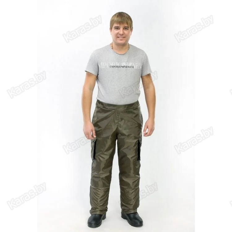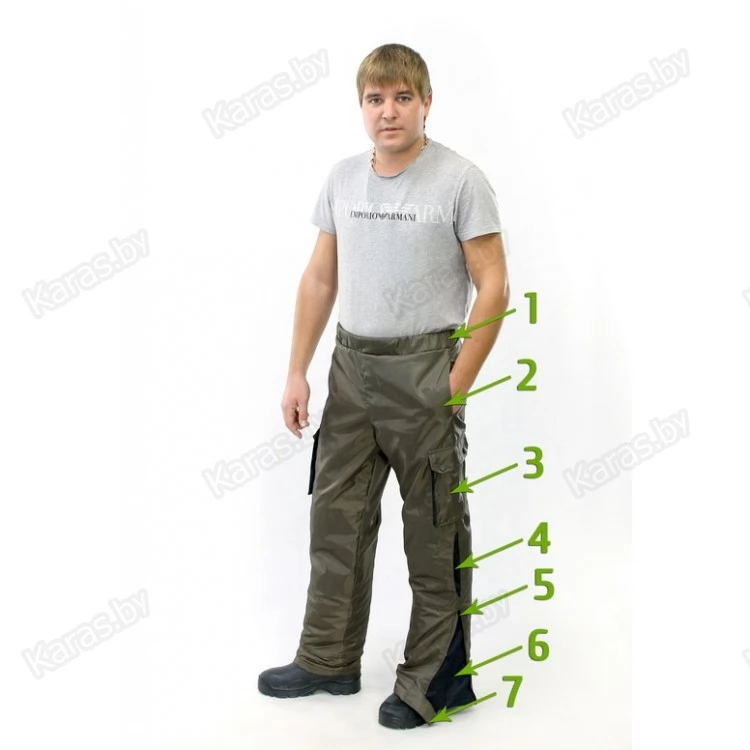 Брюки на поясе на резинке . 2 боковых кармана и 2 накладных объемных кармана-полукнижки с клапанами на кнопках. Наколенники с боковыми входами для вставок из пенополиэтилена, Нижняя часть брюк снабжена раструбом на молнии Т-5 с пуфтой из отделочной ткани. Подкладка до уровня колен выполнена из флиса.