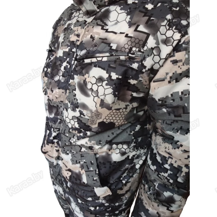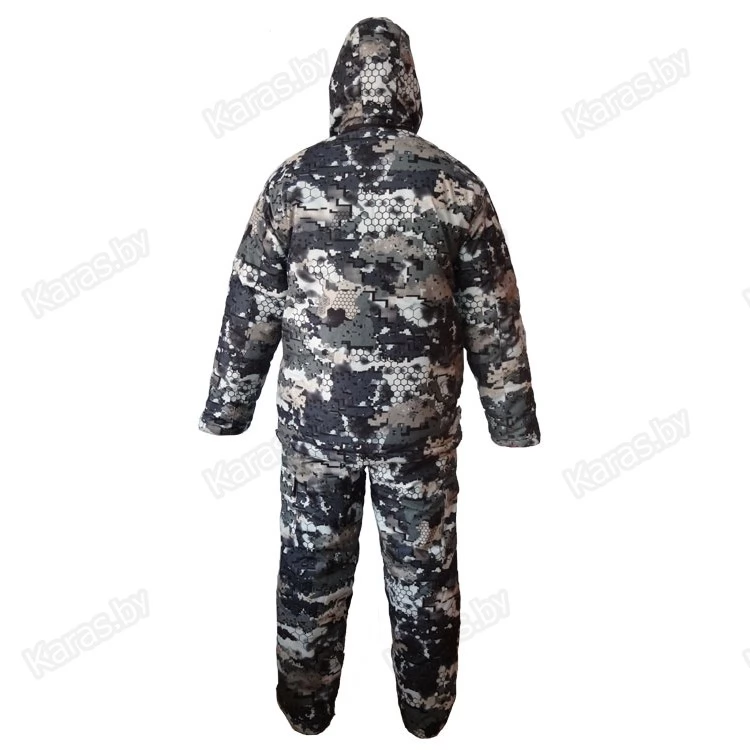 Костюм изготовлен из мембранной ткани Алова. Подкладка Флис. Утеплитель Вайт-Файбер плотностью 300г/м. кв и флис. Благодаря дышащим свойствам флиса, костюм быстро сохнет отводя влагу от тела так же, как и термобелье. Фурнитура производства Польша. Алова - синтетическая ткань, состоящая из трикотажного полиэстерового материала с нанесенным водоотталкивающим покрытием (мембраной) с изнаночной стороны. Современное мембранное покрытие обеспечивает ткани водонепроницаемость и хорошую паропроницаемость. Быстрый отвод испарений с поверхности тела на наружную сторону ткани и защита от проникновения воды (осадков) внутрь одежды - обеспечат комфорт в любую погоду. Ткань алова бархатистая, мягкая на ощупь, имеет хорошие теплоизоляционные свойства, не накапливает влагу, не пропускает влагу снаружи, не продувается, не шуршит и не замерзает на морозе. Этот материал был специально разработан для производства одежды и снаряжения для активного отдыха (альпинизм, горный туризм, рыбалка, охота, экстремальные виды спорта и прочее). Изделия из ткани Алова рекомендуется стирать в теплой воде (t до 30°С) с использованием специальных средств. Гладить теплым утюгом (t до 110°С) только со стороны подкладки. Ткань при стирке не деформируется и не даёт усадки.