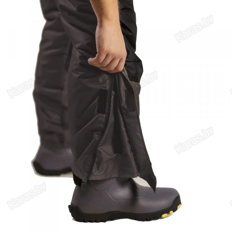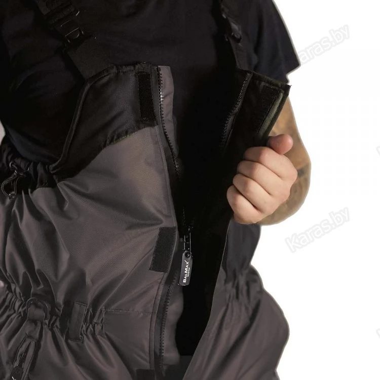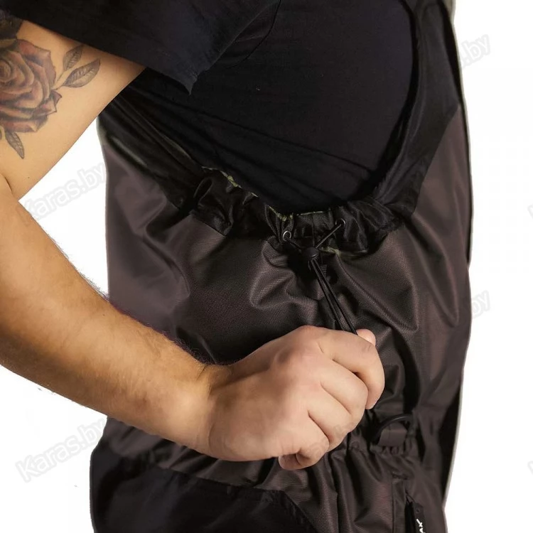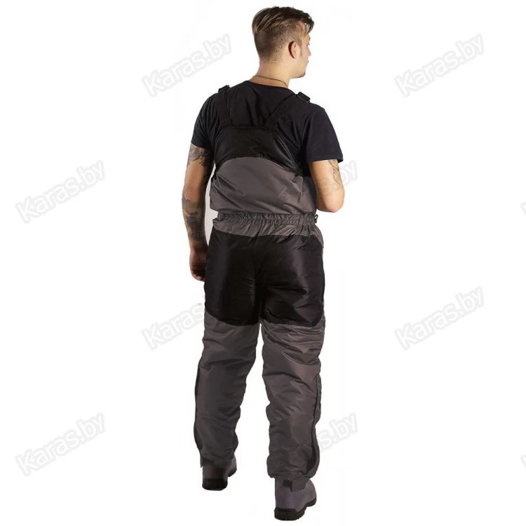 Полукомбинезон застегивается на двухзамковую тракторную молнию, которая прячется под клапаном на кнопках. Широкие лямки на карабинах регулируются по высоте. За счет эластичной резинки в районе талии, полукомбинезон прилегает к телу и не создает помех в движении. Для еще большего удобства область в районе подмышек так же можно стянуть шнурком с фиксатором. Места наиболее подверженные износу (седалище и колени) усилены вторым слоем ткани. Низ колошин снабжен застежкой-молнией для более удобного надевания сапог и манжетой для защиты от снега. На груди расположен карман с клапаном на кнопке. Один сквозных кармана на молнии. Спереди на бедрах размещены два накладных кармана на липучках. В зоне седалища находится полипропиленовая вставка, при необходимости ее можно достать через боковые отверстия на молнии.