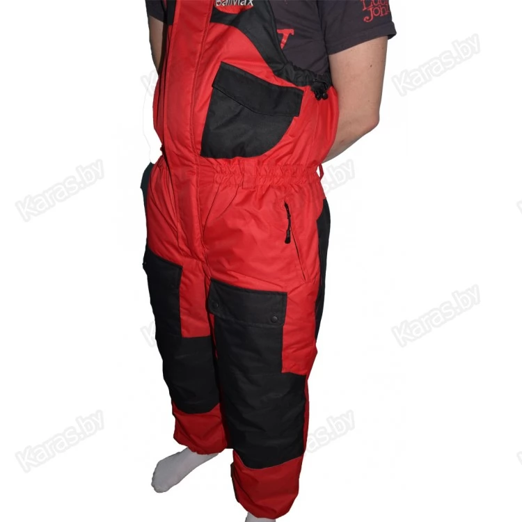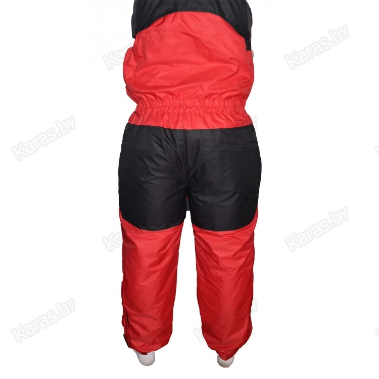 Полукомбинезон застегивается на двухзамковую тракторную молнию, которая прячется под клапаном на кнопках. Широкие лямки на карабинах регулируются по высоте. За счет эластичной резинки в районе талии, полукомбинезон прилегает к телу и не создает помех в движении. Для еще большего удобства область в районе подмышек так же можно стянуть шнурком с фиксатором. Места наиболее подверженные износу (седалище и колени) усилены вторым слоем ткани. Низ колошин снабжен застежкой-молнией для более удобного надевания сапог и манжетой для защиты от снега. На груди расположен карман с клапаном на кнопке. Два сквозных кармана на молнии. Спереди на бедрах размещены два накладных кармана на липучках. В зоне седалища находится полипропиленовая вставка, при необходимости ее можно достать через боковые отверстия на молнии.