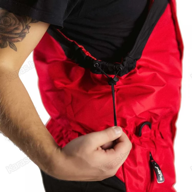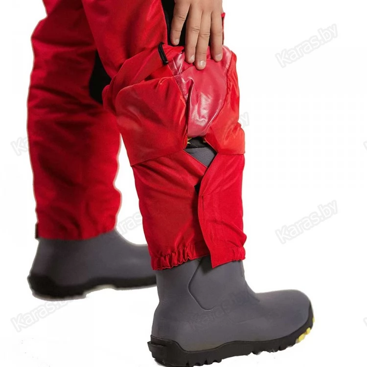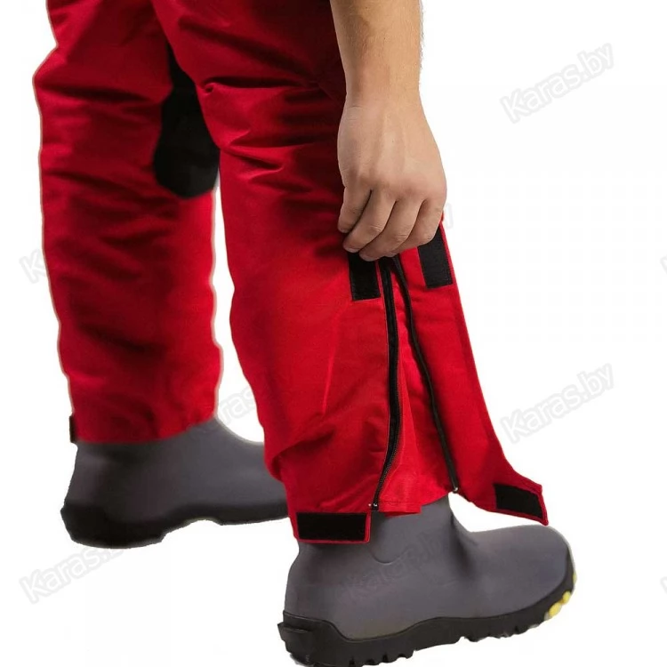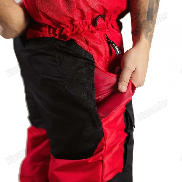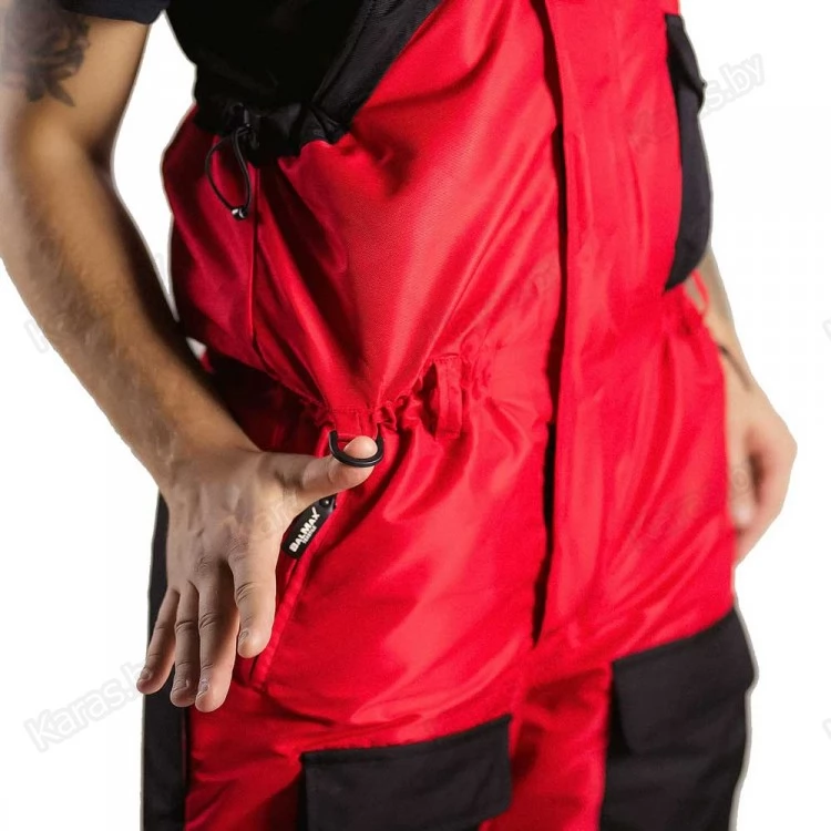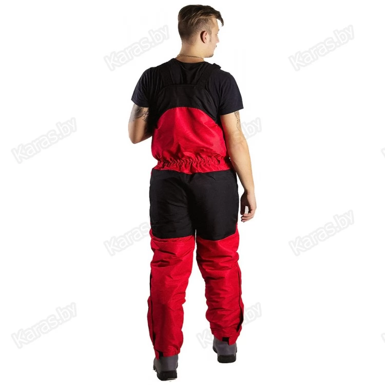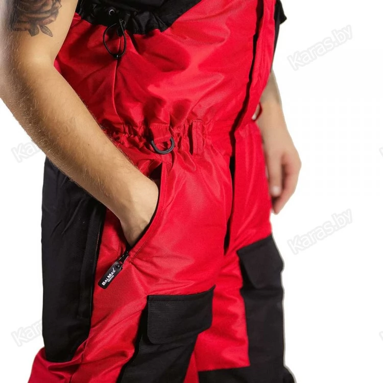 Полукомбинезон застегивается на двухзамковую тракторную молнию, которая прячется под клапаном на кнопках. Широкие лямки на карабинах регулируются по высоте. За счет эластичной резинки в районе талии, полукомбинезон прилегает к телу и не создает помех в движении. Для еще большего удобства область в районе подмышек так же можно стянуть шнурком с фиксатором. Места наиболее подверженные износу (седалище и колени) усилены вторым слоем ткани. Низ колошин снабжен застежкой-молнией для более удобного надевания сапог и манжетой для защиты от снега. На груди расположен карман с клапаном на липучке. Два сквозных кармана на молнии. Спереди на бедрах размещены два накладных кармана на липучках. В зоне седалища находится полипропиленовая вставка, при необходимости ее можно достать через боковые отверстия на молнии.