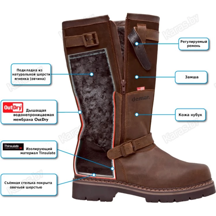 Ботинки Demar Tirol Delux сохраняют тепло внутри обуви, не позволяя ногам замерзнуть даже при длительном нахождении в холодных условиях. Уход за обувью не вызывает сложностей: внешняя часть сапог моется под проточной водой, а съемный носок можно стирать в стиральной машинке.