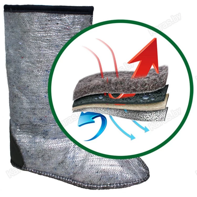 Сапоги укомплектованы вставным утеплителем, состоящим из 4 основных слоев, и обеспечивающим сапогам температурный предел эксплуатации до -50°C: