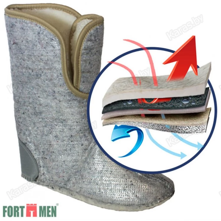 Сапоги укомплектованы вставным утеплителем, состоящим из 5 основных слоев, и обеспечивающим сапогам температурный предел эксплуатации до -60°C: