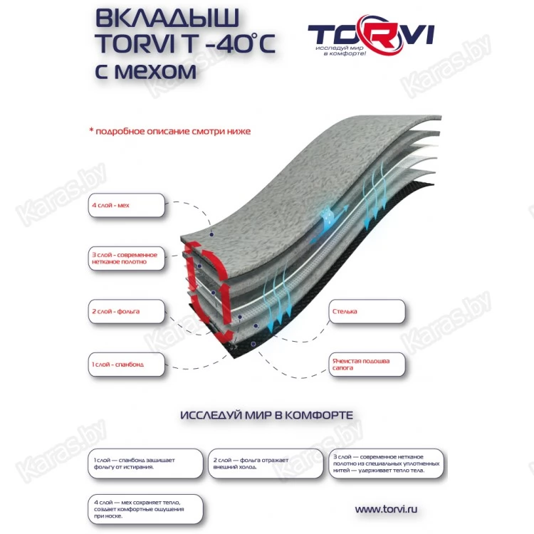 Сменный теплый вкладыш в сапогах из ЭВА TORVI - 40 °C состоит из нескольких видов материала. Весь этот многослойный «сэндвич» работает на защиту от внешнего холода, сохранение тепла тела, выведение влаги и удобство движения.