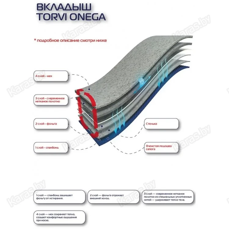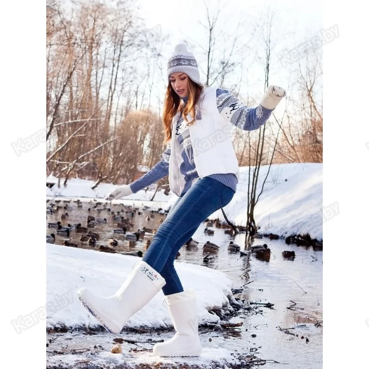 Внешняя часть сапог выполнена из легкого, водонепроницаемого и эластичного материала ЭВА, а внутренний сменный вкладыш - из 4х слойного нетканого полотна с меховым слоем, надежно защищают тело человека от влаги и холода.