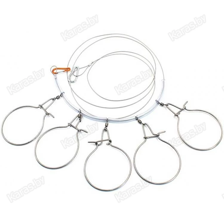 Кукан Namazu N-FTAF-295 подойдет для бережной транспортировки трофеев при ловле с лодки. Эта модель от бренда Namazu оснащена пятью круглыми карабинами. Надежные застежки не дадут норовистой рыбе сорваться, проволока не боится щучьих зубов. Карабины закреплены при помощи вертлюгов на определенном расстоянии. В качестве разграничителей используются силиконовые трубочки. Металлический трос диаметром 2 мм имеет длину 3 м. Крепится к лодке (колышкам и т.д.) с помощью надежных карабинов.