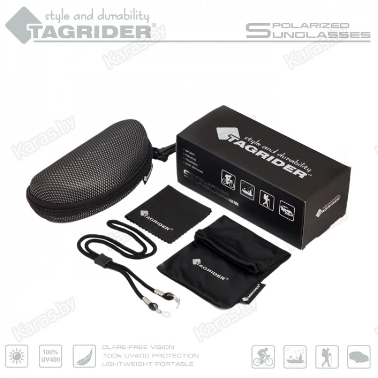 Поляризационные очки Tagrider оснащены прогрессивным 400 UV фильтром защиты от ультрафиолетового излучения, что позволяет полностью убрать негативное воздействие света на глаза и использовать их на солнце с любой интенсивностью. Прогрессивный светофильтр сохраняет всю гамму цветов предмета и усиливает свое действие с увеличением интенсивности света. Стекла с многослойной поляризацией снимают блики с любых отражающих поверхностей и делают изображение более четким. Затылочный держатель с фиксатором предотвратит падение и обеспечит надежную посадку очков даже при активном движении или занятии спортом. Очки выполнены из гипоаллергенного ударопрочного полимера марки ABS. В комплекте специальная карточка для проверки поляризации очков.