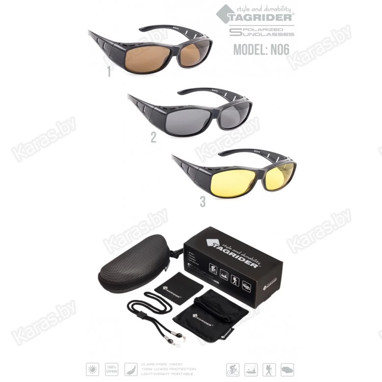 Поляризационные очки Tagrider оснащены прогрессивным 400 UV фильтром защиты от ультрафиолетового излучения, что позволяет полностью убрать негативное воздействие света на глаза и использовать их на солнце с любой интенсивностью. Прогрессивный светофильтр сохраняет всю гамму цветов предмета и усиливает свое действие с увеличением интенсивности света. Стекла с многослойной поляризацией снимают блики с любых отражающих поверхностей и делают изображение более четким. Затылочный держатель с фиксатором предотвратит падение и обеспечит надежную посадку очков даже при активном движении или занятии спортом. Очки выполнены из гипоаллергенного ударопрочного полимера марки ABS. В комплекте специальная карточка для проверки поляризации очков.