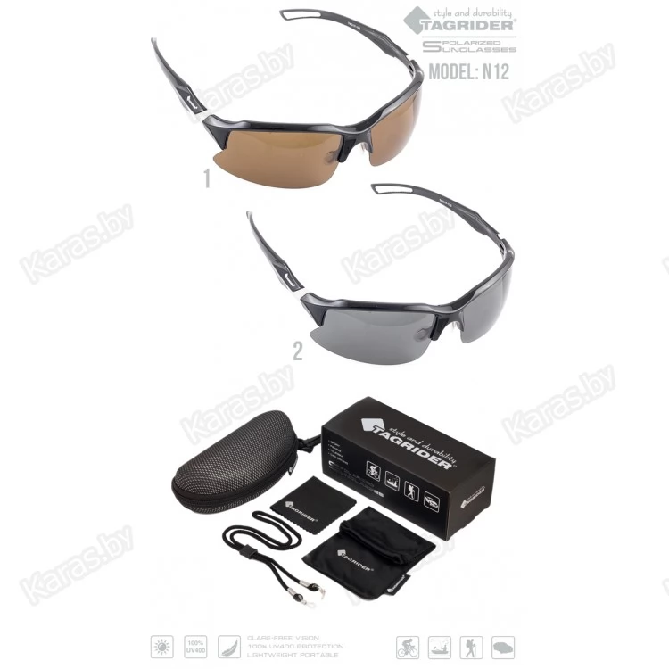 Поляризационные очки Tagrider оснащены прогрессивным 400 UV фильтром защиты от ультрафиолетового излучения, что позволяет полностью убрать негативное воздействие света на глаза и использовать их на солнце с любой интенсивностью. Прогрессивный светофильтр сохраняет всю гамму цветов предмета и усиливает свое действие с увеличением интенсивности света. Стекла с многослойной поляризацией снимают блики с любых отражающих поверхностей и делают изображение более четким. Затылочный держатель с фиксатором предотвратит падение и обеспечит надежную посадку очков даже при активном движении или занятии спортом. Очки выполнены из гипоаллергенного ударопрочного полимера марки ABS. В комплекте специальная карточка для проверки поляризации очков.