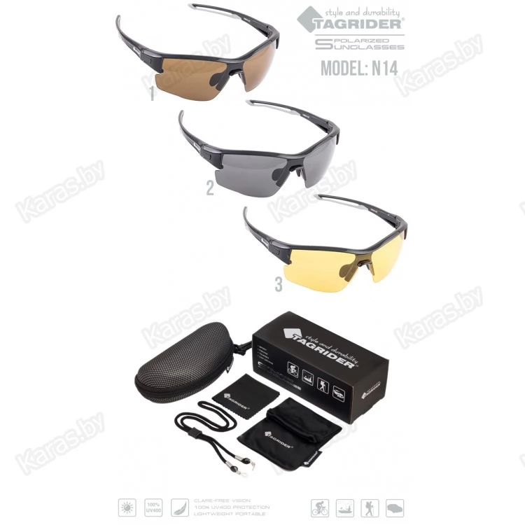 Поляризационные очки Tagrider оснащены прогрессивным 400 UV фильтром защиты от ультрафиолетового излучения, что позволяет полностью убрать негативное воздействие света на глаза и использовать их на солнце с любой интенсивностью. Прогрессивный светофильтр сохраняет всю гамму цветов предмета и усиливает свое действие с увеличением интенсивности света. Стекла с многослойной поляризацией снимают блики с любых отражающих поверхностей и делают изображение более четким. Затылочный держатель с фиксатором предотвратит падение и обеспечит надежную посадку очков даже при активном движении или занятии спортом. Очки выполнены из гипоаллергенного ударопрочного полимера марки ABS. В комплекте специальная карточка для проверки поляризации очков.