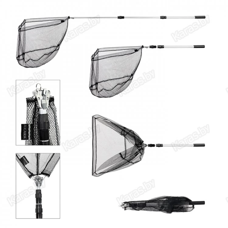 Складной телескопический подсачек с треугольной головой. Сетка выполнена из полиэстера.