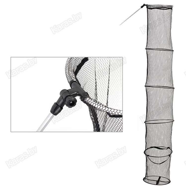 Вместительные садки с прорезиненной сеткой. Оборудованы поворотным устройством для установки необходимого наклона входного отверстия. Стойка для установки садка на берегу в комплекте. 5 секций, длина 245 см.
