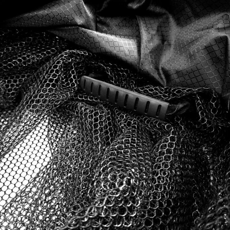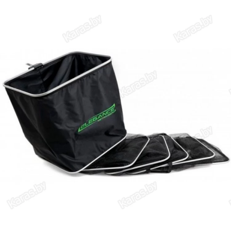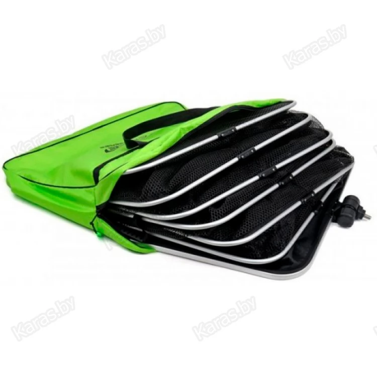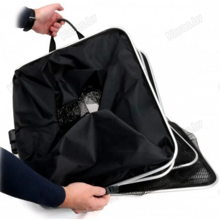 Первоклассный садок прямоугольной формы с алюминиевыми обручами и прочной прорезиненной сеткой. Входная часть горловины усилена плотным материалом, а первый обруч имеет увеличенные габариты. Садок оснащён двумя ручками для удобного извлечения из воды. Они находятся внутри, надёжно закреплены на третьем обруче снизу. Держатель садка имеет механизм регулировки угла и резьбу для установки на стойку. Садок комплектуется  качественной, практичной транспортировочной сумкой.