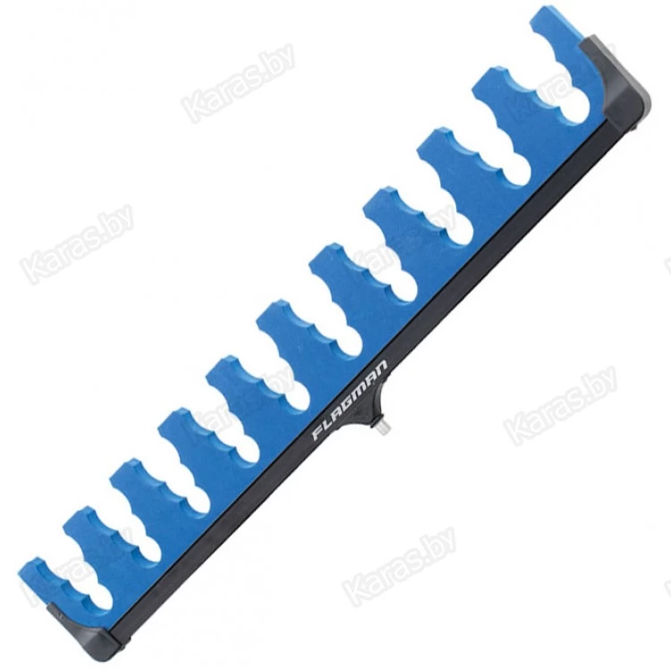 Гребенка Flagman на 10 удилищ. Предназначена для хранения запасных удилищ и топ-китов на рыбалке. Выполнена на алюминиевой раме из мягкого пористого материала EVA, предохраняющего бланки удилищ от царапин. Оснащена стандартным резьбовым соединением для крепления. Каждая ячейка рассчитана на три разных по толщине бланка, которые надежно фиксируются в гребенке.