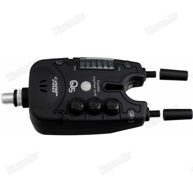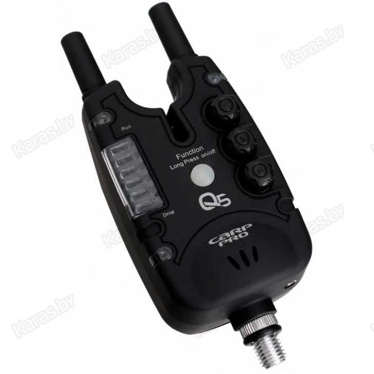 Прочный корпус сигнализатора поклевки выполнен из пластика, имеет влагозащиту и оборудован боковыми фиксаторами Snag Ears, которые не дают удилищу упасть при порывах бокового ветра и мощных боковых поклевках. Сигнализатор CarpPro Q5 выдает звук разной тональности при поклевках от берега и к берегу. Звук дублируется световой индикацией: бегущая дорожка светодиодов показывает направление поклевки. На корпусе установлены три ручки, которые регулируют тон, громкость звука, а также чувствительность сигнализатора. Во время вращения ручки упомянутый световой индикатор отображает установленный уровень громкости, тона, чувствительности – в зависимости от того, какую ручку вращать. На передней панели находится датчик освещенности, который в темное время суток включает ночной режим – подсветку центральной белой кнопки. Сигнализатор оборудован режимом «антивор»: если его включить, то при снятии удилища с сигнализатора включается громкий звуковой сигнал, сопровождающийся миганием подсветки.