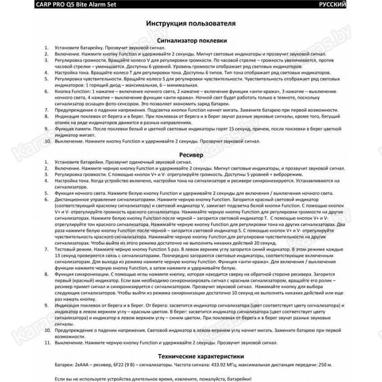 Для питания сигнализаторов используются батарейки типа «Крона», для ресивера – элементы ААА (элементы питания в комплект не входят). Наборы поставляются в удобном и надежном пластиковом кейсе.