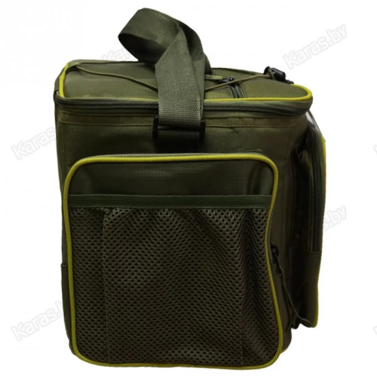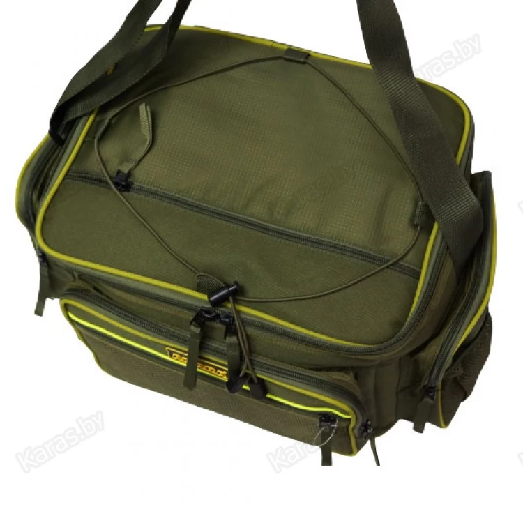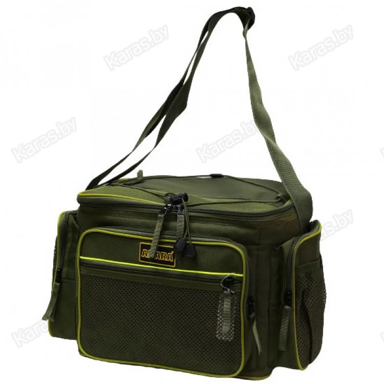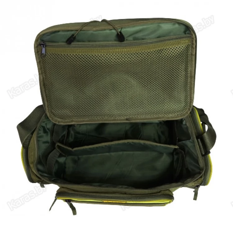 Сумка Akara Tacklebag green 35L - предназначена для рыбалки, охоты и активного отдыха. Имеет один большой отсек с разделителем на липучках. Количество внешних карманов на замках – 5, на резинках – 2. Основной отсек закрывается клапаном с внутренним карманом – сеточкой на замке. Спинка сумки имеет жесткую пластиковую вставку.