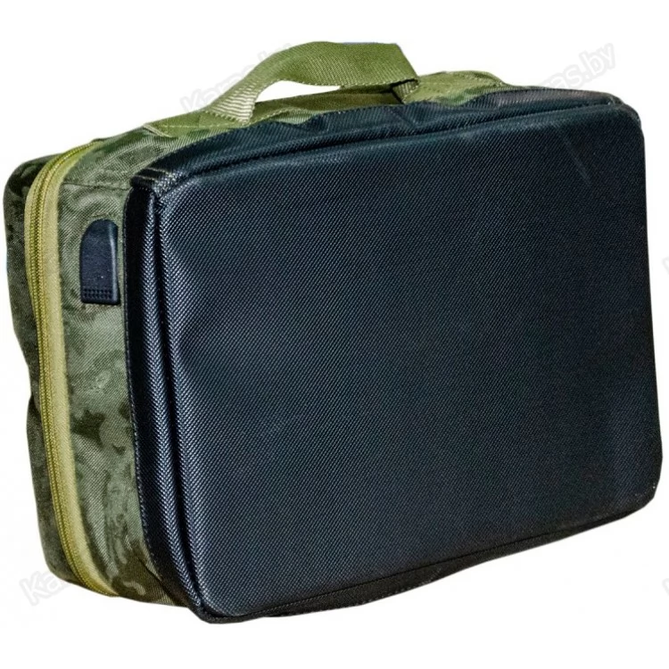 Carp Pro Diamond Tech Bag – сумка-кейс для карповых гаджетов и аксессуаров. Изготовлена из фирменного влагостойкого камуфлированного материала Oxford 650D. Жесткая крышка изготовлена как столик, на котором удобно пользоваться гаджетами. Крышка имеет бортик, не позволяющий гаджетам соскользнуть, специальное углубление для удобства установки телефона или планшета в вертикальное положение, а также выемку в бортике, которая облегчает зарядку устройств, не позволяя шнуру заламываться, а штеккеру разбивать гнездо для зарядки. Сбоку кейса выведен наружный разъем USB, подключаемый идущим в комплекте кабелем к Power Bank. Внутренняя часть крышки-столика имеет один большой карман с клапаном для планшета и три прошитых сетчатых кармашка на молнии – для хранения шнуров, батареек и прочих небольших аксессуаров. Внутреннее пространство сумки для гаджетов разделено съемными перегородками на три отделения. Мягкие перегородки с креплениями на липучках надежно защищают содержимое, при этом позволяя с легкостью трансформировать размеры отделений под ваши нужды. Днище кейса оснащено твердой вставкой из ПВХ, защищающей его от проникновения влаги. Для удобства транспортировки предусмотрена ручка.