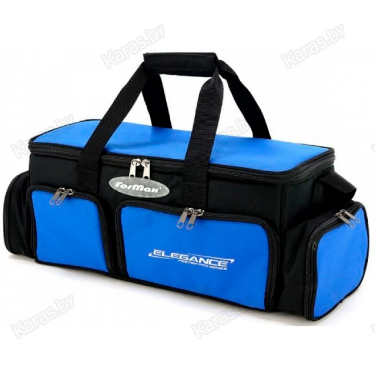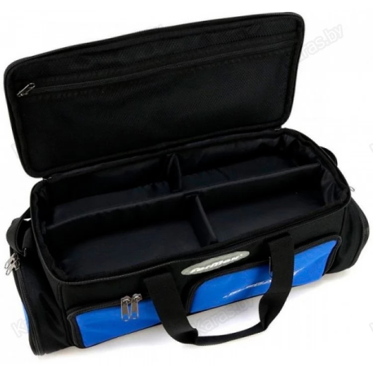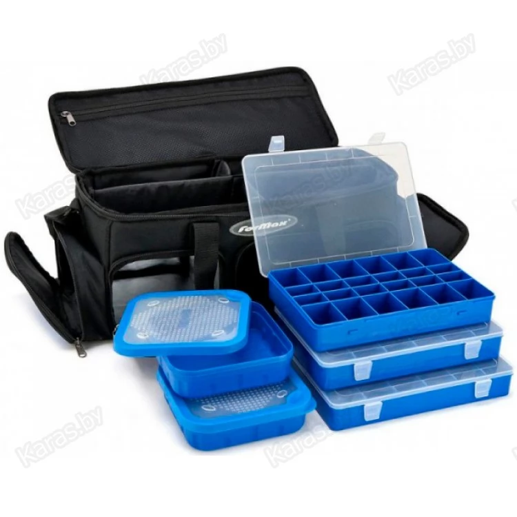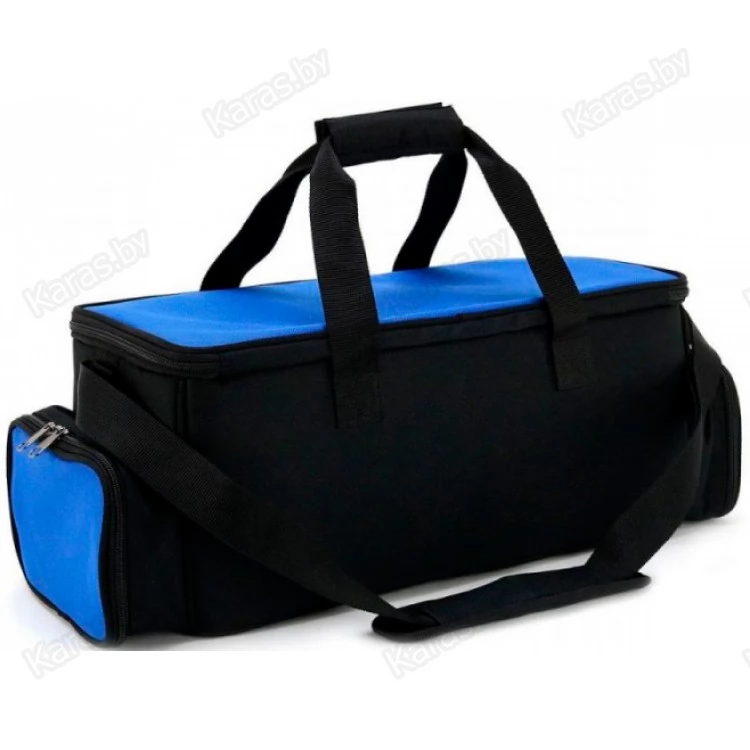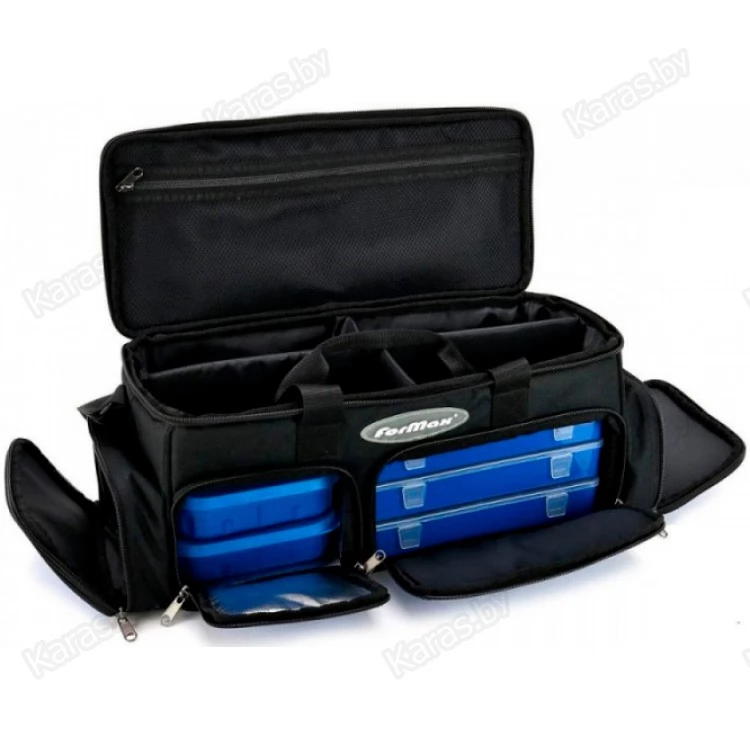Первоклассная и очень функциональная фидерная сумка. Она имеет большой отсек в верхней части, термо отделение с двумя ящиками для приманок внизу слева и три большие коробки для мелких аксессуаров внизу справа.